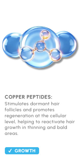 Hair loss often begins when your follicles go dormant, unable to produce thick, healthy strands. The main ingredient, Copper Peptides, in work at the cellular level to reactivate these dormant follicles, promoting new, natural growth and restoring hair density.