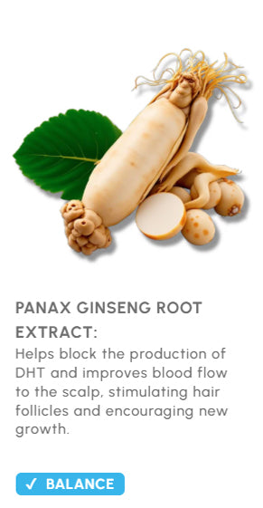 As you age, DHT level start to increase , leading to the appearance of thinning hair and bald patches. rich in Panax Ginseng and Licorice Root Extract. These are powerful growth factors that help reduce DHT, making way for new, healthy hair growth . This combination helps restore hair density, for a complete scalp rejuvenation .